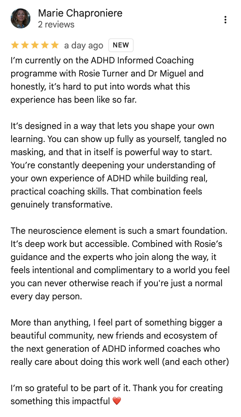 We train coaches to deliver ADHD informed, certified, science backed coaching that unlocks performance, purpose and identity without pathologising the client.